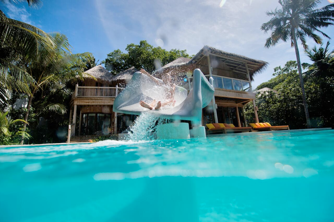 The resort’s children’s club, The Den, is one of the largest in the Maldives, featuring waterslides, arts and crafts, and even a pirate ship. Parents can take advantage of the resort’s many amenities, from diving excursions to spa treatments. The villas also come with a private “Mr. or Ms. Friday” butler, who ensures every need is met during your stay.